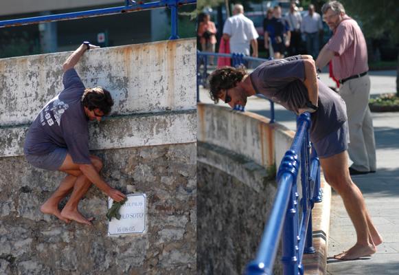 Descripción: La placa dedicada a Manolo Soto estaba algo sucia. Eso era inaceptable para Javi que no dudó en descolgarse por la pared para limpiarla, pese a que todo el mundo le recomendó utilizar una fregona.