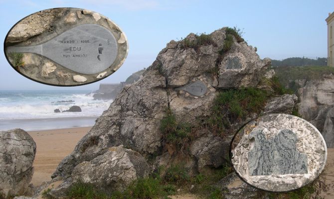 Descripción: En ésta roca de la Playa del Camello cuya figura característica se ve ahogándose en la mar, se erige una pala de mármol en memoria de Edu Muñiz, un recuerdo de sus amigos.