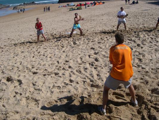Descripción: Manuel (de espaldas) junto con Clara y Javi. Al fondo, los chicos del KiteSurf preparando sus cometas.