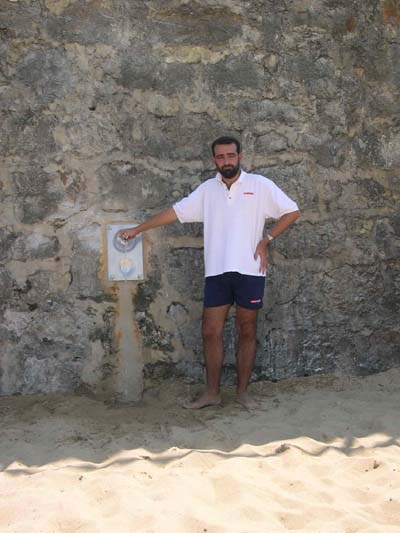 Descripción: "Javier como orgulloso padre que enseña a su hijo. Y es que el mérito de tener un grifo de agua para beber al lado de la zona de palas es, en gran parte, suyo."