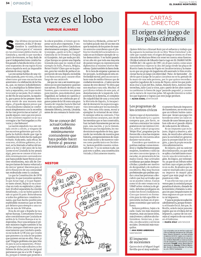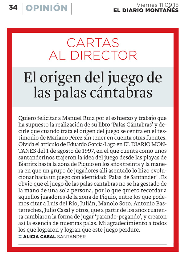 "Quiero felicitar a Manuel Ruiz por el esfuerzo y trabajo que ha supuesto la realización de su libro ‘Palas Cántabras’ y decirle que cuando trata el origen del juego se centra en el testimonio de Mariano Pérez sin tener en cuenta otras fuentes. Olvida el artículo de Eduardo García-Lago en EL DIARIO MONTAÑÉS del 1 de agosto de 1997, en el que cuenta como unos santanderinos trajeron la idea del juego desde las playas de Biarritz hasta la zona de Piquio en los años treinta y la manera en que un grupo de jugadores allí asentado lo hizo evolucionar hacia un juego con identidad: ‘Palas de Santander´. Es obvio que el juego de las palas cántabras no se ha gestado de la mano de una sola persona, por lo que quiero recordar a aquellos jugadores de la zona de Piquio, entre los que podemos citar a Luis del Río, Julián, Manolo Soto, Antonio Basterrechea, Julio Casal y otros, que a partir de los años cuarenta cambiaron la forma de jugar ‘parando-pegando’, y crearon así la esencia de nuestras palas. Mi agradecimiento a todos los que lograron y logran que este juego perdure."