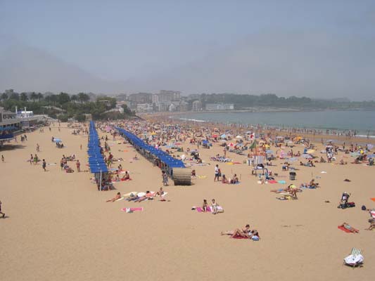 Descripción: Vista de la Primera Playa del Sardinero. Los toldos azules se han convertido en parte del paisaje veraniego del mundo de las palas.