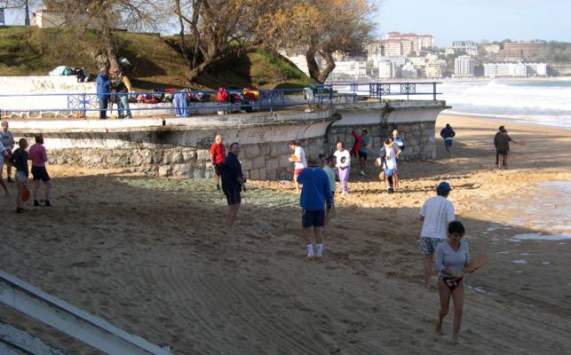 Descripción: En la playa de la Concha una ola cogió por sorpresa a los palistas, que tuvieron que dejar rápidamente sus partidas para evitar el chapuzón.
