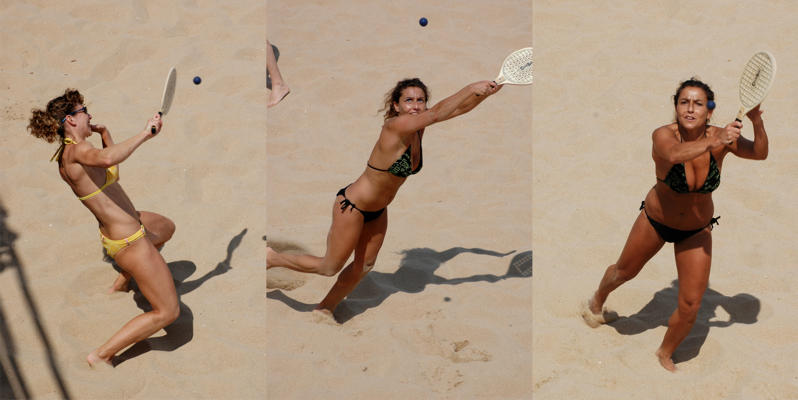 Descripción: Vaya par de "domingueras" jugando con "paletas" y pelotitas azules. Si es lo que tiene el verano, que se nos llena la zona de turistas.