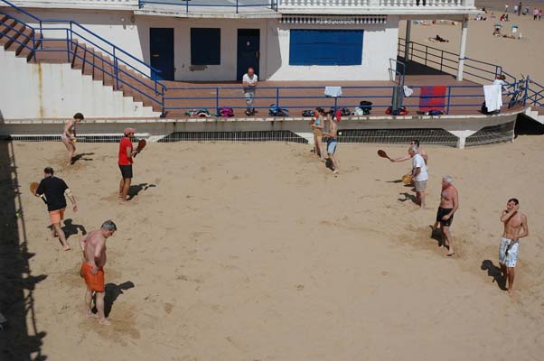 Descripción: Jugando en la playa con el fondo de la Caracola. En la terraza los más rezagados esperan a ser como mínimo tres, antes de saltar a la arena y comenzar una nueva partida.