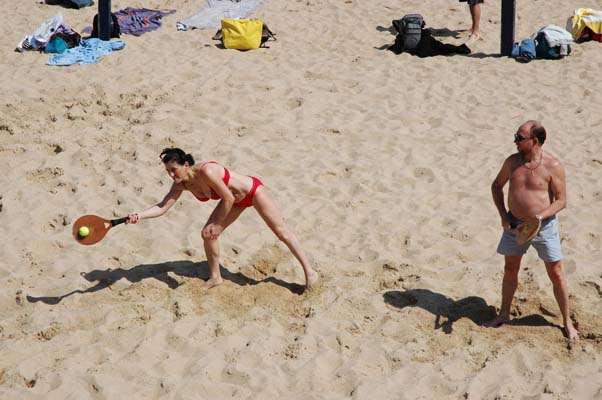 Descripción: Marisol y Vicente. "¿Tendrá la bola pegada a la pala?", parece pensar Vicente.