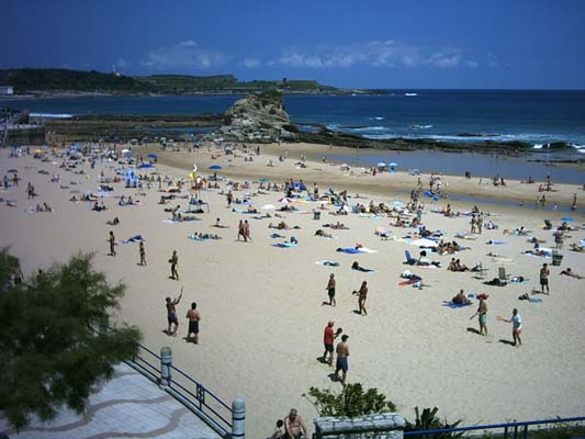 Descripción: Vista de la Playa del Camello. Vemos la zona donde juegan los palistas en un día con numerosas partidas.