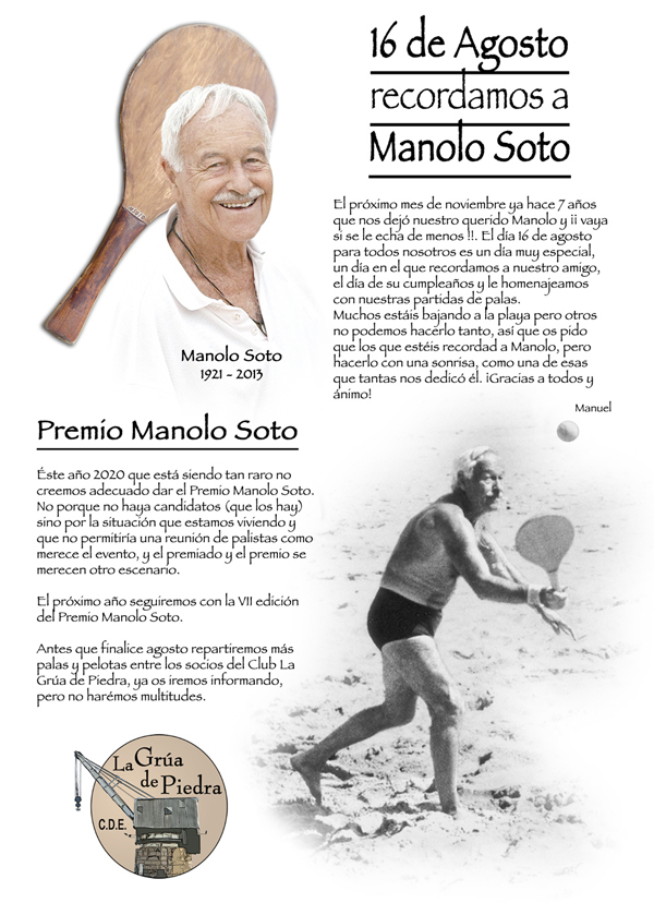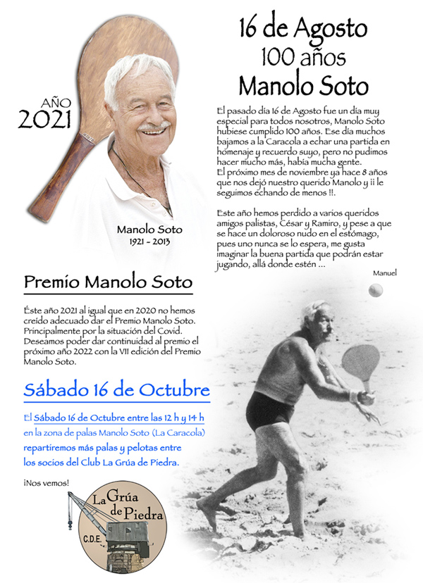 El 4 de noviembre de 2013 nos dejó Manolo Soto a los 92 años de edad. A nadie de los que tuvimos la suerte de conocerlo nos cabe la menor duda de que fue un deportista excepcional en las tres modalidades que le apasionaron: la montaña, el esquí, y sobre todo, el juego de las palas.