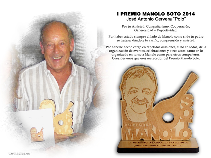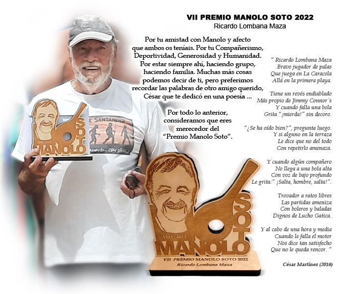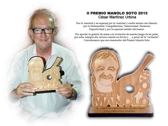 "Por tu Amistad y en especial por tu Amistad y cariño mutuo con Manolo, por tu Humanidad, Compañerismo, Generosidad, Paciencia, Deportividad y por tu especial sentido del humor. Por aportar tu granito de arena a la evolución de nuestro juego de las palas, por estar siempre ahí, incluso cuando no llovía y … a pesar de tu "cucharón" (…) Consideramos que eres merecedor del “Premio Manolo Soto”.