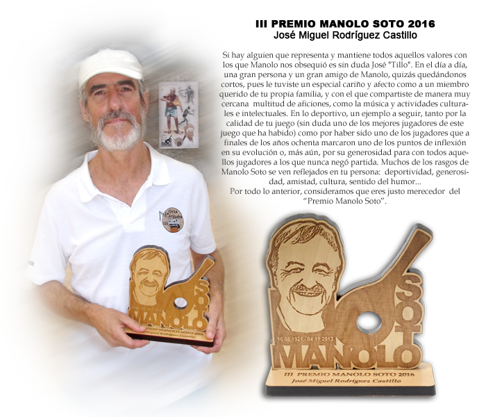 Si hay alguien que representa y mantiene todos aquellos valores con los que Manolo nos obsequió es sin duda José "Tillo". En el día a día, una gran persona y un gran amigo de Manolo, quizás quedándonos cortos, pues le tuviste un especial cariño y afecto como a un miembro querido de tu propia familia, y con el que compartiste de manera muy cercana multitud de aficiones, como la música y actividades culturales e intelectuales. En lo deportivo, un ejemplo a seguir, tanto por la calidad de tu juego (sin duda uno de los mejores jugadores de este juego "absurdo" que ha habido) como por haber sido uno de los jugadores que a finales de los años ochenta marcaron uno de los puntos de inflexión en su evolución o, más aún, por su generosidad para con todos aquellos jugadores a los que nunca negó partida. Muchos de los rasgos de Manolo Soto se ven reflejados en tu persona: deportividad, generosidad, amistad, cultura, sentido del humor... Por todo lo anterior, consideramos que eres justo merecedor del “Premio Manolo Soto”.