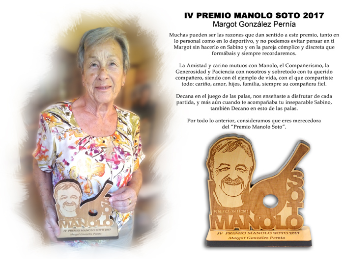Muchas pueden ser las razones que dan sentido a este premio, tanto en lo personal como en lo deportivo, y no podemos evitar pensar en ti Margot sin hacerlo en Sabino y en la pareja cómplice y discreta que formábais y siempre recordaremos. La Amistad y cariño mutuos con Manolo, el Compañerismo, la Generosidad y Paciencia con nosotros y sobretodo con tu querido compañero, siendo con él ejemplo de vida, con el que compartiste todo: cariño, amor, hijos, familia, siempre su compañera fiel. Decana en el juego de las palas, nos enseñaste a disfrutar de cada partida, y más aún cuando te acompañaba tu inseparable Sabino, también Decano en esto de las palas. Por todo lo anterior, consideramos que eres merecedora del “Premio Manolo Soto”.