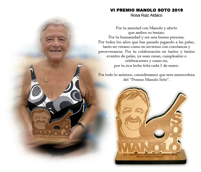 Por tu amistad con Manolo y afecto que ambos os teníais. Por tu humanidad y ser una buena persona. Por todos los años que has pasado jugando a las palas, tanto en verano como en invierno con constancia y perseverancia. Por tu colaboración en tantos y tantos eventos de palas, ya sean cenas, cumpleaños o celebraciones y como no, por tu rica leche frita cada 1 de enero. Por todo lo anterior, consideramos que eres merecedora del “Premio Manolo Soto”.