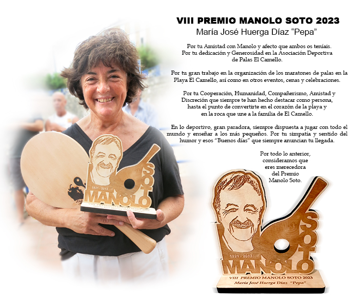 Por tu Amistad con Manolo y afecto que ambos os teníais. Por tu dedicación y Generosidad en la Asociación Deportiva de Palas El Camello. Por tu gran trabajo en la organización de los maratones de palas en la Playa El Camello, así como en otros eventos, cenas y celebraciones. Por tu Cooperación, Humanidad, Compañerismo, Amistad y Discreción que siempre te han hecho destacar como persona, hasta el punto de convertirte en el corazón de la playa y en la roca que une a la familia de El Camello. En lo deportivo, gran paradora, siempre dispuesta a jugar con todo el mundo y enseñar a los más pequeños. Por tu simpatía y sentido del humor y esos “Buenos días” que siempre anuncian tu llegada. Por todo lo anterior, consideramos que eres merecedora del Premio Manolo Soto.