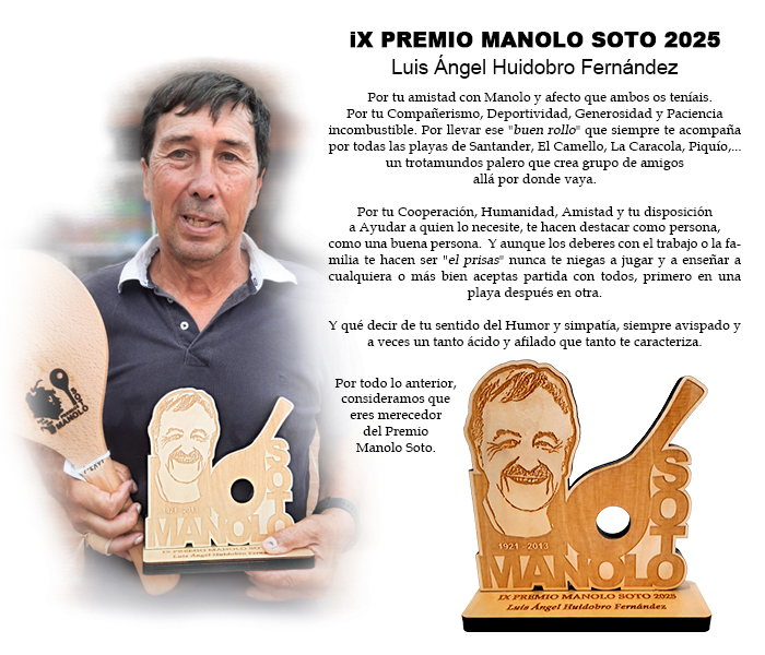 Por tu amistad con Manolo y afecto que ambos os teníais. Por tu Compañerismo, Deportividad, Generosidad y Paciencia incombustible. Por llevar ese "buen rollo" que siempre te acompaña por todas las playas de Santander, El Camello, La Caracola, Piquío,... un trotamundos palero que crea grupo de amigos allá por donde vaya. Por tu Cooperación, Humanidad, Amistad y tu disposición a Ayudar a quien lo necesite, te hacen destacar como persona, como una buena persona. Y aunque los deberes con el trabajo o la familia te hacen ser "el prisas" nunca te niegas a jugar y a enseñar a cualquiera o más bien aceptas partida con todos, primero en una playa después en otra. Y qué decir de tu sentido del Humor y simpatía, siempre avispado y a veces un tanto ácido y afilado que tanto te caracteriza. Por todo lo anterior, consideramos que eres merecedor del Premio Manolo Soto.